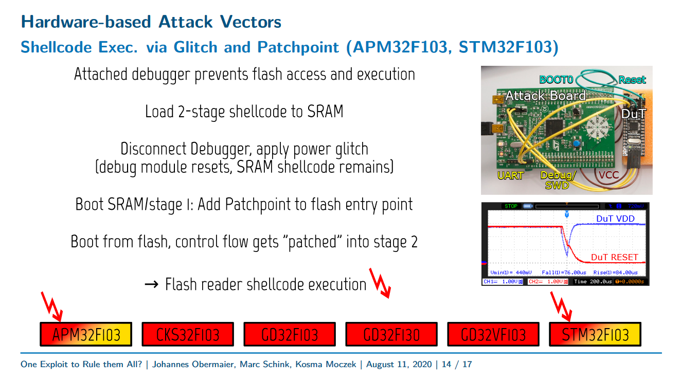 I have created a three stage exploit-chaining payload that, combined with hardware glitching, allows for bypassing RDP on all STM32F1 devices (and some counterfeits/clones). The main exploit uses a novel self-debugging technique that's potentially useful against all ARM devices utilizing the standard Cortex-M FPB unit. The glitcher/debugger board has been affectionally dubbed stm32f1uck, for STM32F1 Unauthorized Copying Kit. The complete setup can be read about in the USENIX WOOT 20 paper.
